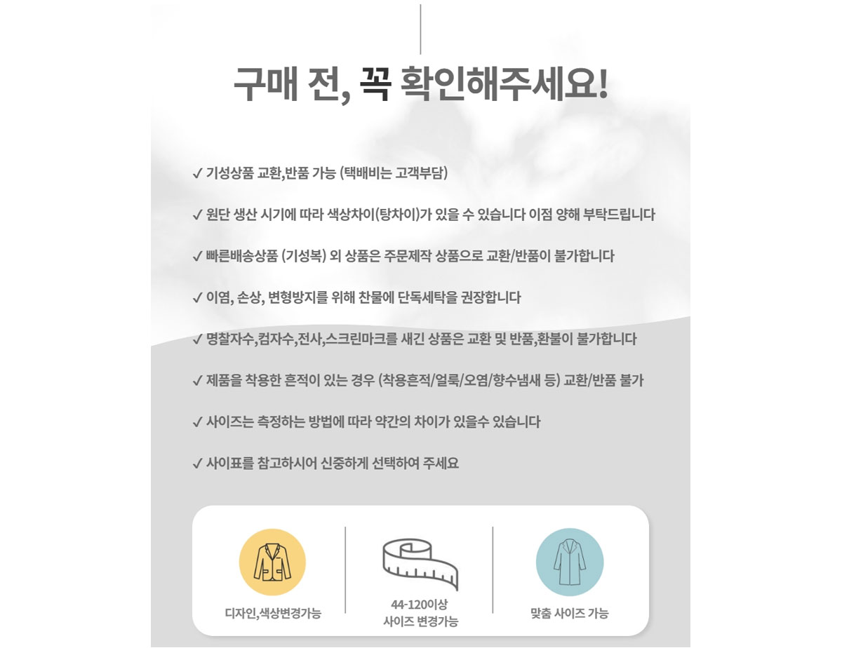 °ü·Ã¹ý¹× ¼ÒºñÀÚ ºÐÀïÇØ°á ±ÔÁ¤¿¡ µû¸£³ª, ÁÖ¹®Á¦ÀÛ»óǰ(º°µµ ¸ÂÃãÀ̳ª ±â¼º»çÀÌÁî¶óµµ ÁÖ¹®Á¦ÀÛµÈ »óǰ¹× Ä¡¸¶)Àº ±³È¯, ¹ÝǰÀÌ ºÒ°¡ÇÕ´Ï´Ù.